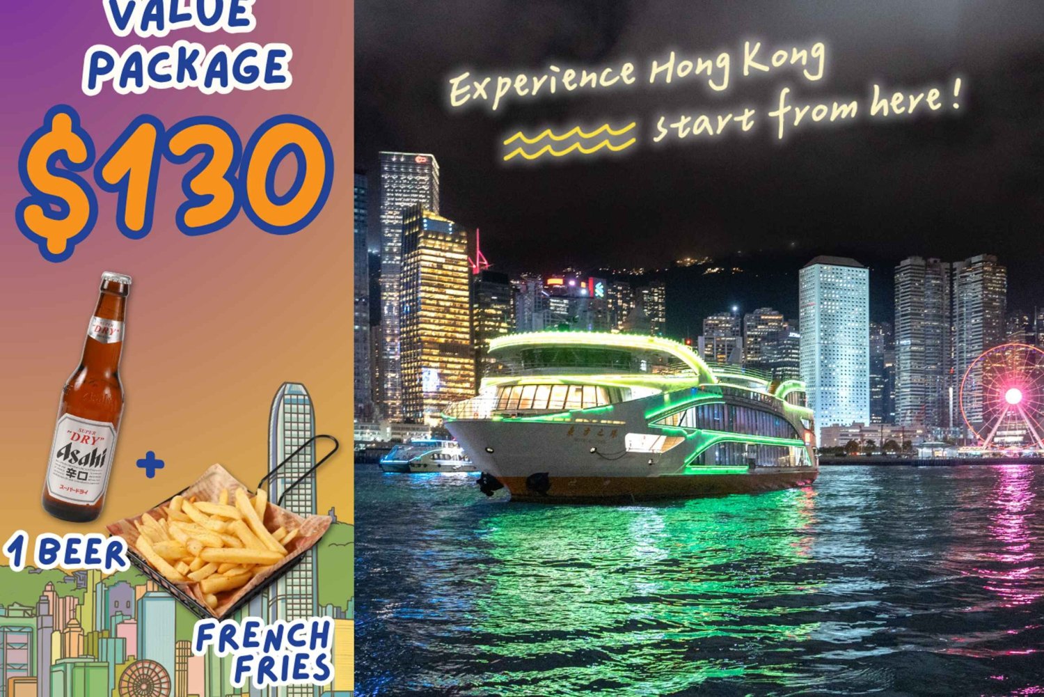 Enjoy drinks and set sail on the Oriental Pearl Harbour Cruise and experience Hong Kong’s world-famous skyline from the shimmering Victoria Harbour. Perfect for travelers seeking breathtaking views and unforgettable moments. Value Package Offer To enjoy a drink with snack and to witness Hong Kong’s dazzling nightly light view which make the evening cruise a truly magical experience. Enjoy Harbour Cruise with Iconic Landmarks Marvel at Hong Kong’s world-famous landmarks, including the towering ICC Tower, the elegant Bank of China building, and historic sites like the Tsim Sha Tsui Clock Tower. From modern architectural wonders to cultural treasures, the cruise offers a unique perspective of the city’s highlights. Oriental Pearl Harbour Cruise 'Bar On Board' is the perfect way to enjoy your night and explore Hong Kong’s vibrant skyline in style.Includes