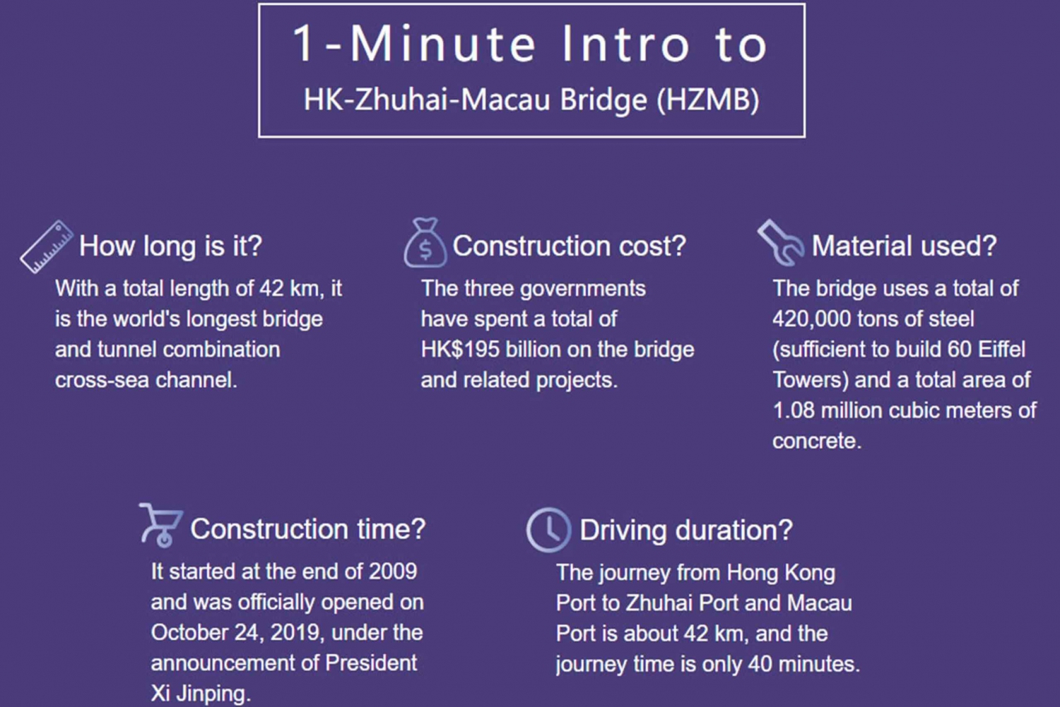Börja på en anmärkningsvärd resa över Hong Kong-Zhuhai-Macao Bridge med vår exklusiva Limo Transfer-tjänst. Denna imponerande tekniska bedrift förbinder tre dynamiska regioner och erbjuder inte bara en rutt utan en upplevelse fylld med fantastiska vyer och sömlös resa. Våra lyxiga limousiner ger den perfekta miljön för avkoppling och komfort, oavsett om du är på väg till ett möte eller utforskar nya äventyr. Med professionella chaufförer vid ratten kan du luta dig tillbaka och njuta av resan och veta att du kommer fram till din destination med stil och i tid. Låt oss hantera detaljerna i din transfer, så att du kan njuta av varje ögonblick av din resa över denna ikoniska bro. Information om fordonet Bilmodell: MPV Grupp med 6 passagerare eller färre och 4 bagage av standardstorlekIncludes